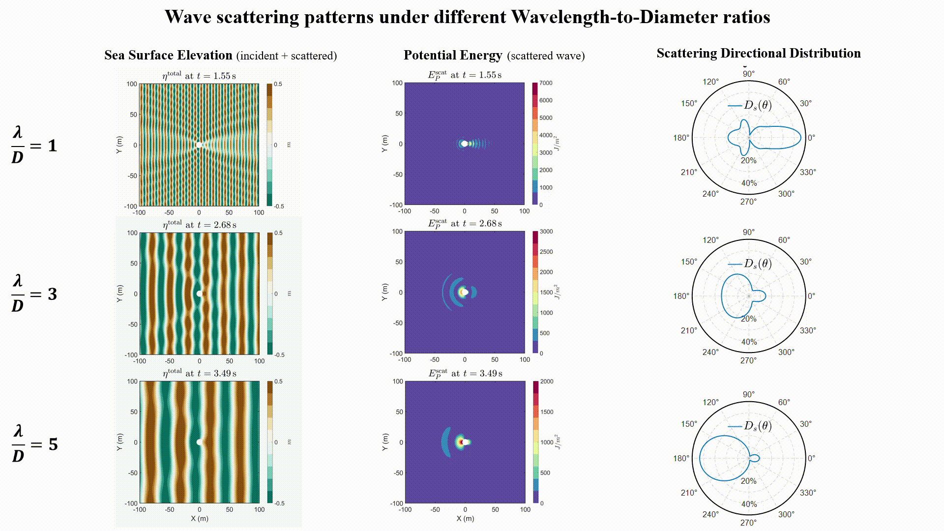 Offshore wind turbines and wave energy devices interact with ocean waves in complex ways, but these interactions are often treated in a highly simplified manner in spectral wave models. In this work, I developed a new parameterization based on classical wave theory to represent wave–structure interactions, in which total wave energy is conserved while being redistributed across wave directions to account for scattering by cylindrical structures. This method has been implemented in WAVEWATCH III as a source term. This project helped shape how I approach scientific problem. Rather than relying on empirical fixes, I learned to focus on the underlying physical principles and to build solutions directly from them.